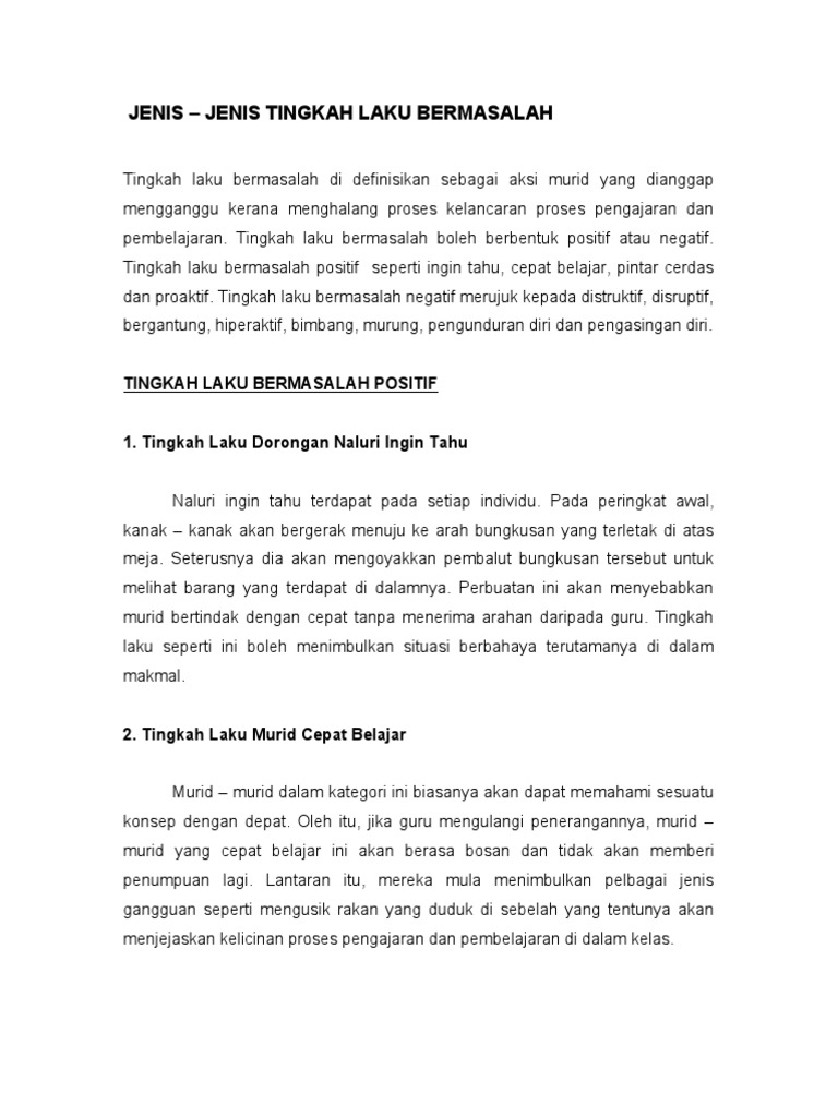 Punca tingka laku bermasalah and bilik darjah pdf. Saya telah membuat pemerhatian bagi setiap darjah di sekolah terbabit. Masalah tingkah laku murid juga disebabkan oleh murid yang mempunyai masalah pembelajaran tiada motivasi untuk belajar dan estim kendiri yang rendah. Di samping itu penulis turut membincangkan punca-punca manusia melakukan tingkah laku seksual dan kesan yang dialami dalam konteks Islam.